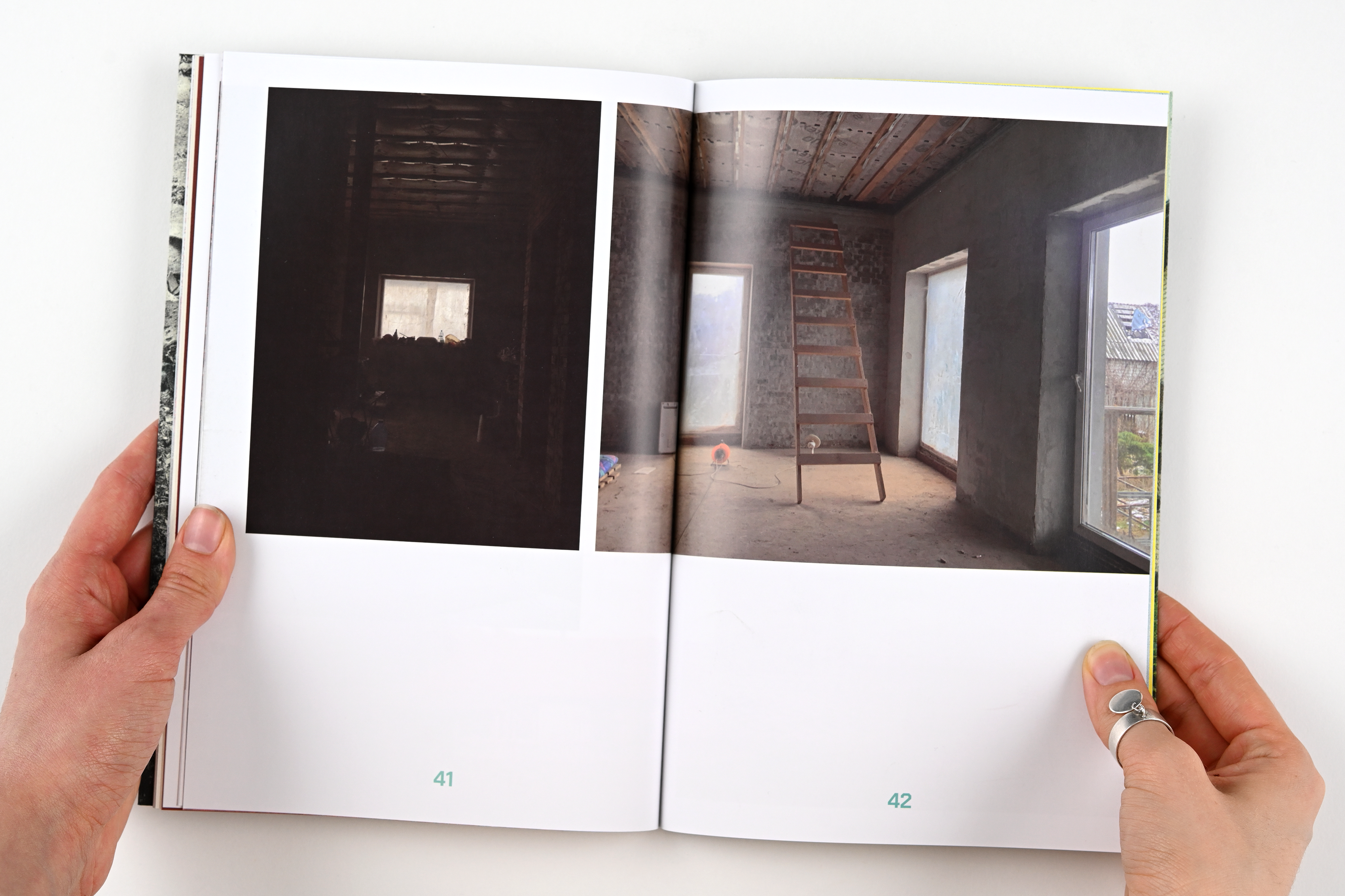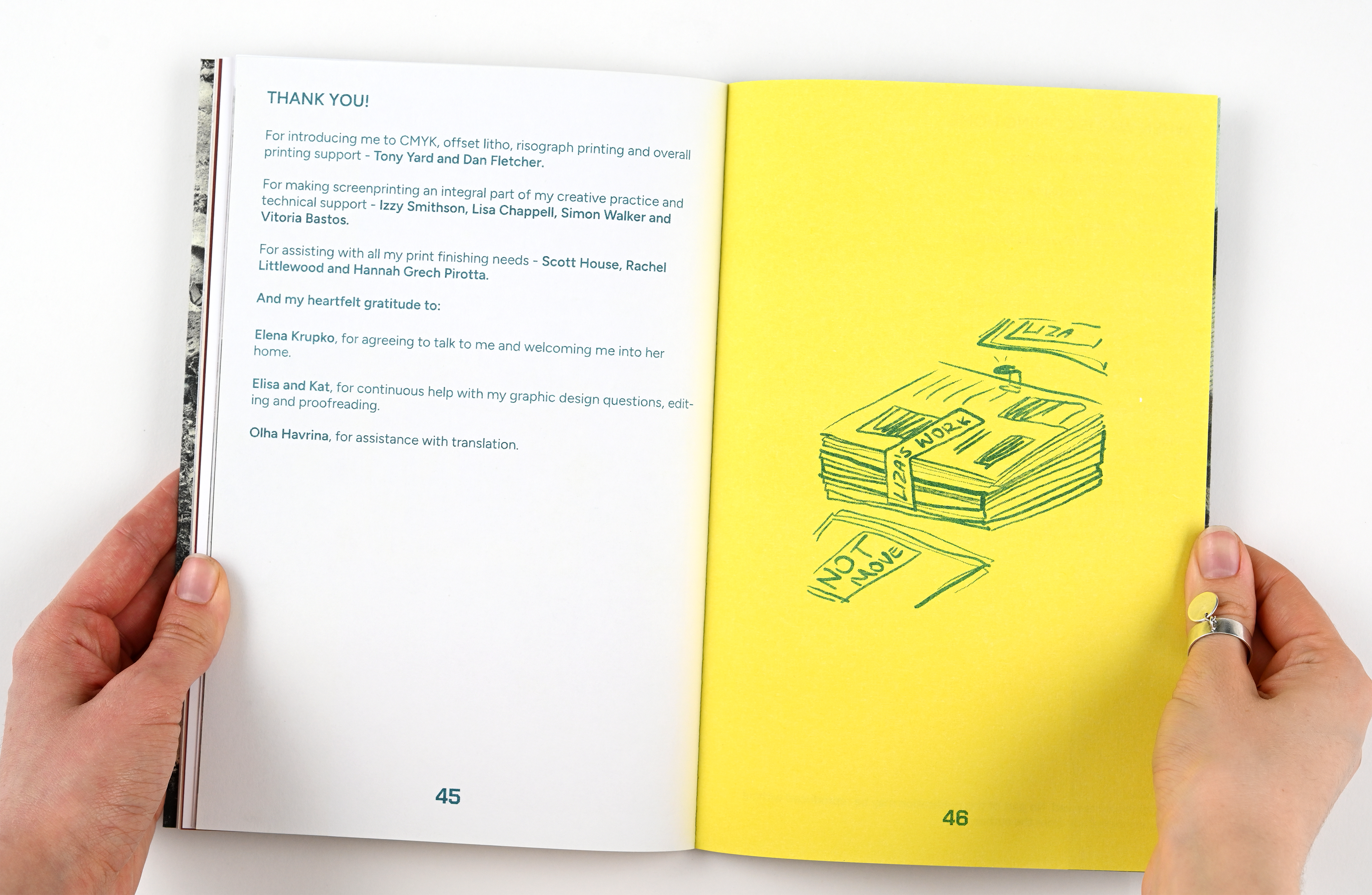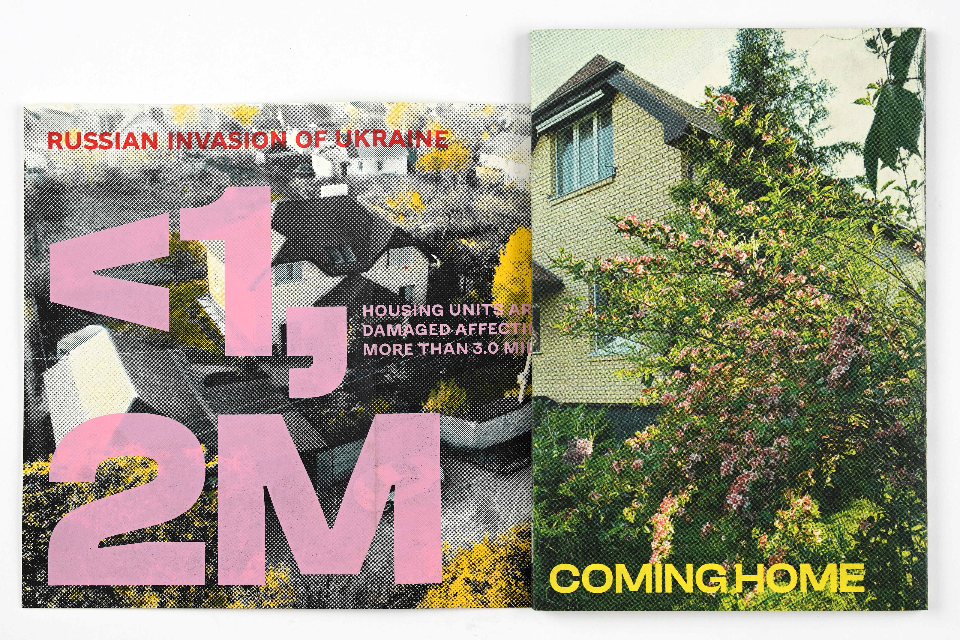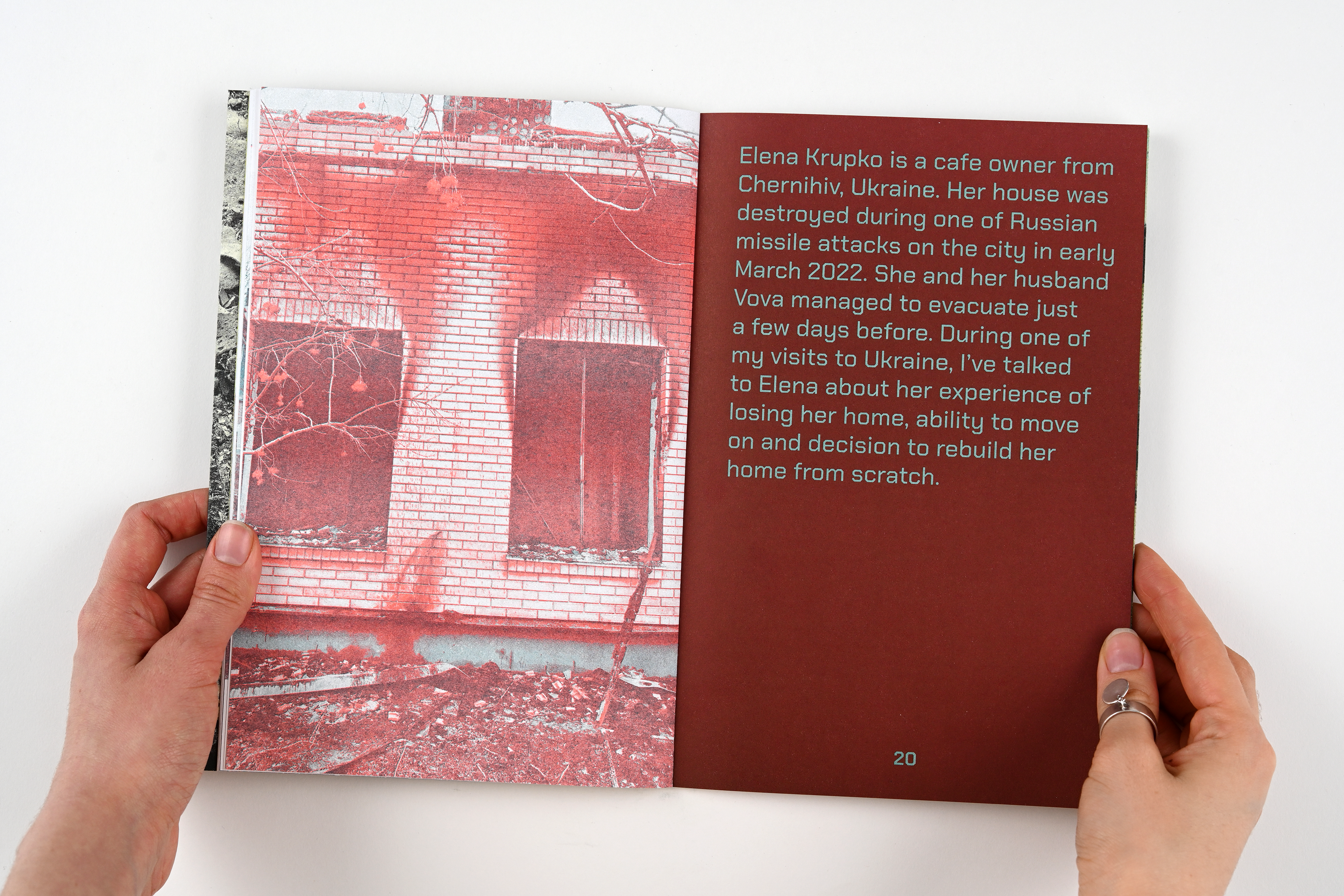 This publication explores war through the lens of a story of a destroyed house by a Russian missile in Chernihiv, Ukraine. Elena Krupko and her family lost everything to the Russian strike, but they managed to find the strength to rebuild their home from the ashes of their past. This publication is a way of paying tribute to those who have lost where they belonged to Russian aggression and, despite the odds, continue to move on with their lives, restore their homes and stay hopeful. I made this publication using a variety of printing methods such as offset lithography (2 colour and CMYK), risograph and screenprinting. Each section of this book is designed according to the machine’s specifics, adjusting the colour, layout and typography every time. Each book is hand-bound with a foldout poster in the front pocket of the book. Additionally, a Ukrainian transcript of the interview is available upon demand.